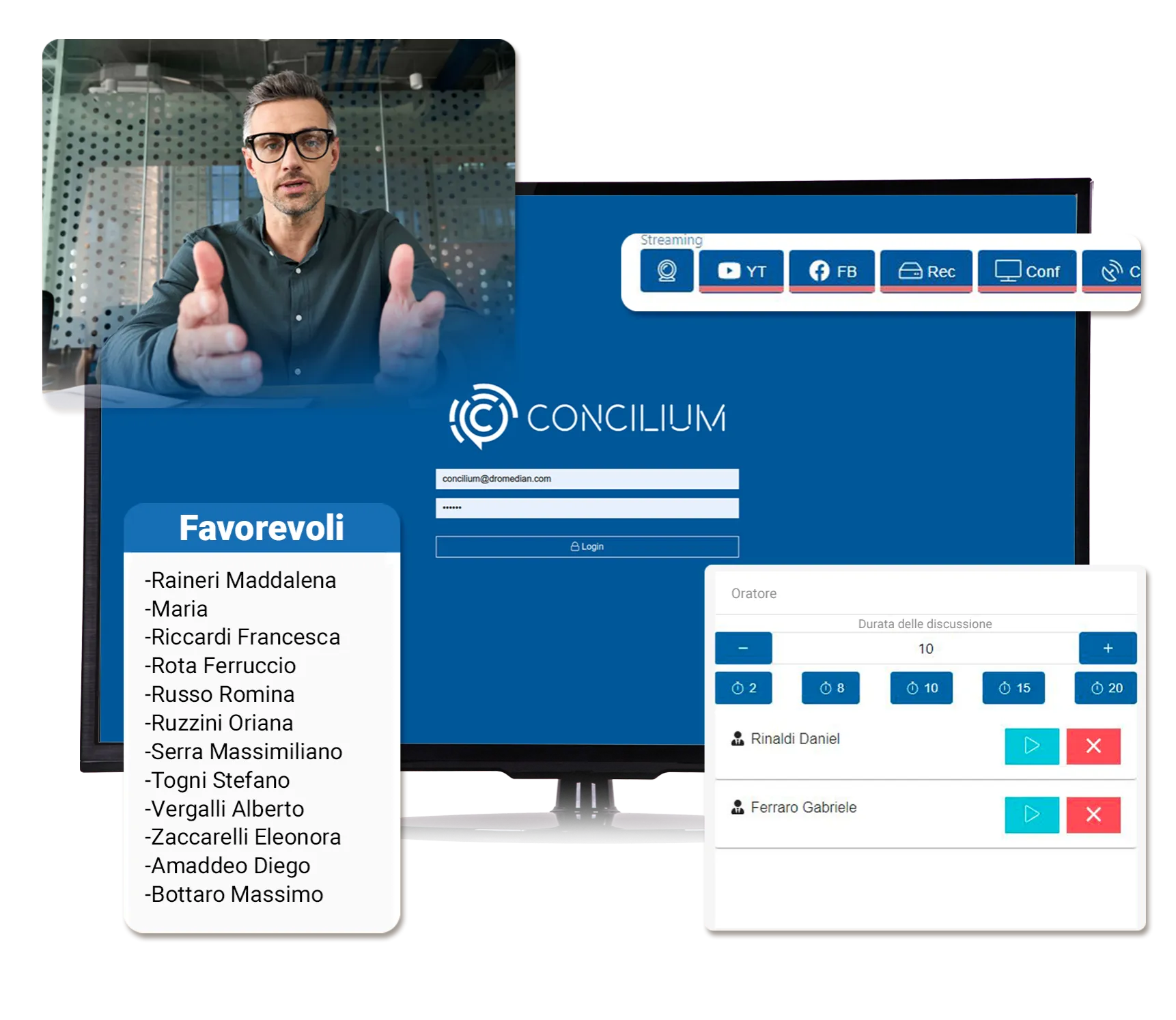 Una regia completa della riunione da un'unica postazione. Concilium ti fornisce gli strumenti per essere un regista a tutti gli effetti: decidi l’inizio e la fine della riunione, controllerai i microfoni, l’apertura e chiusura delle votazioni e molto altro ancora.